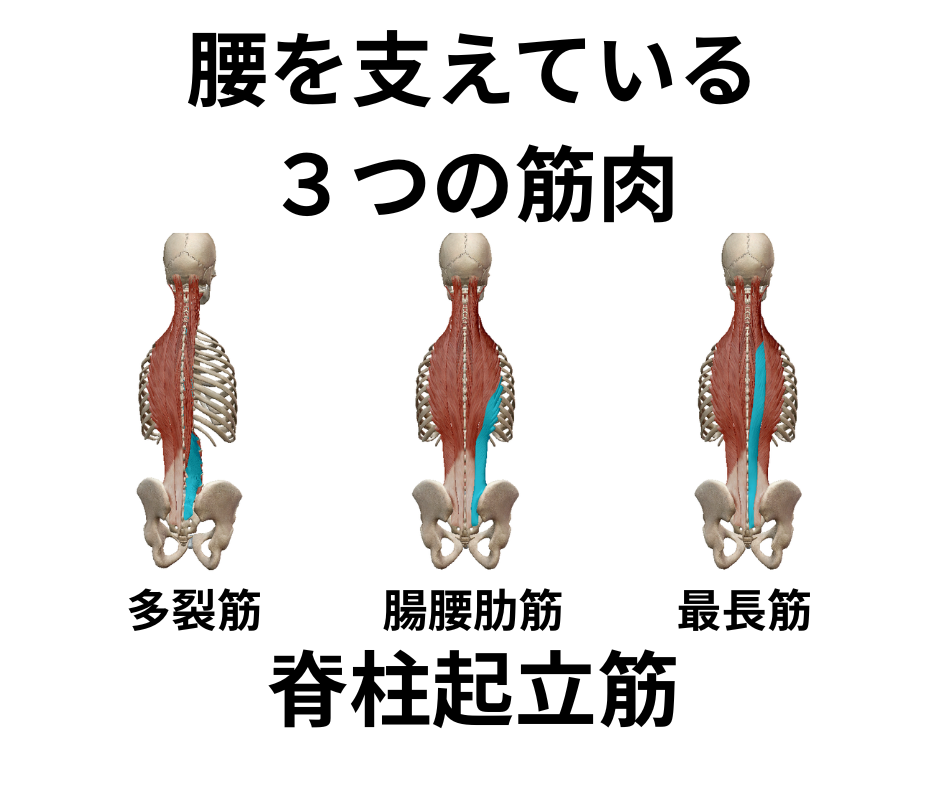 背筋を支える「脊柱起立筋」は、主に最長筋・腸肋筋・多裂筋の3つで構成されています。