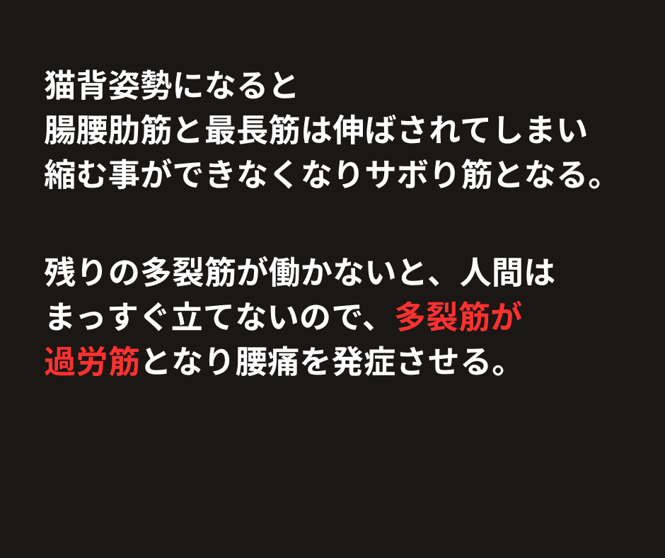 いわば、**多裂筋が「ブラック企業のワンオペ状態」**になってしまい、悲鳴をあげているのが腰痛の正体なのです。